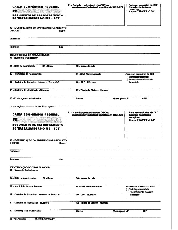 A partir 05/03/12, foi substituído pelo formulário DCN - Documento de Cadastramento do NIS.(Circular nº 574, de 02/03/12, DOU de 05/03/12).